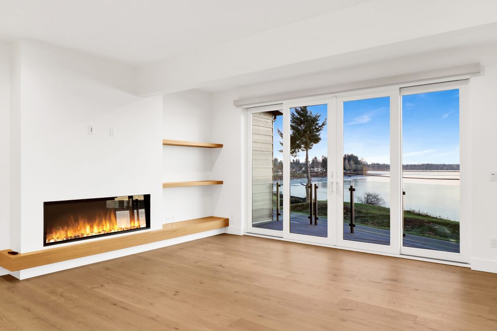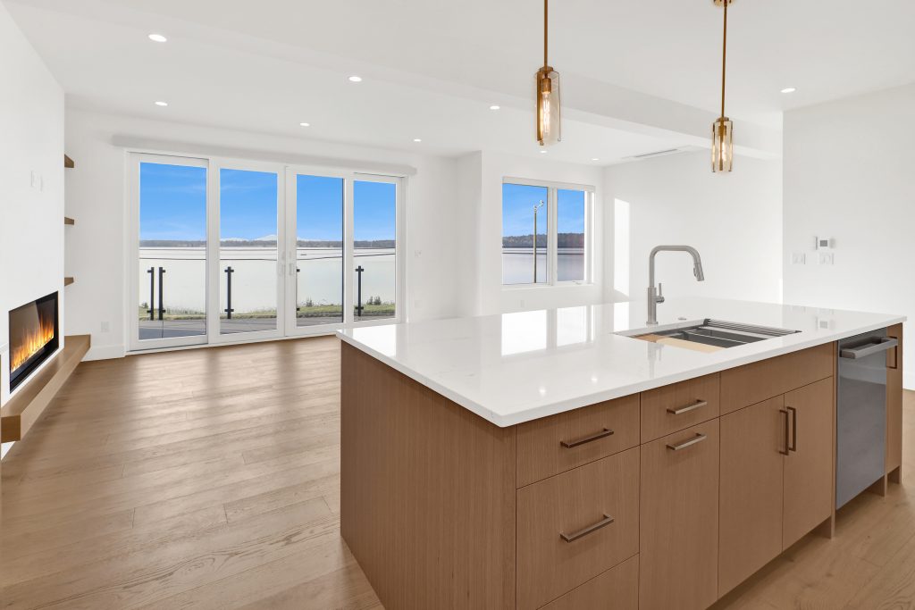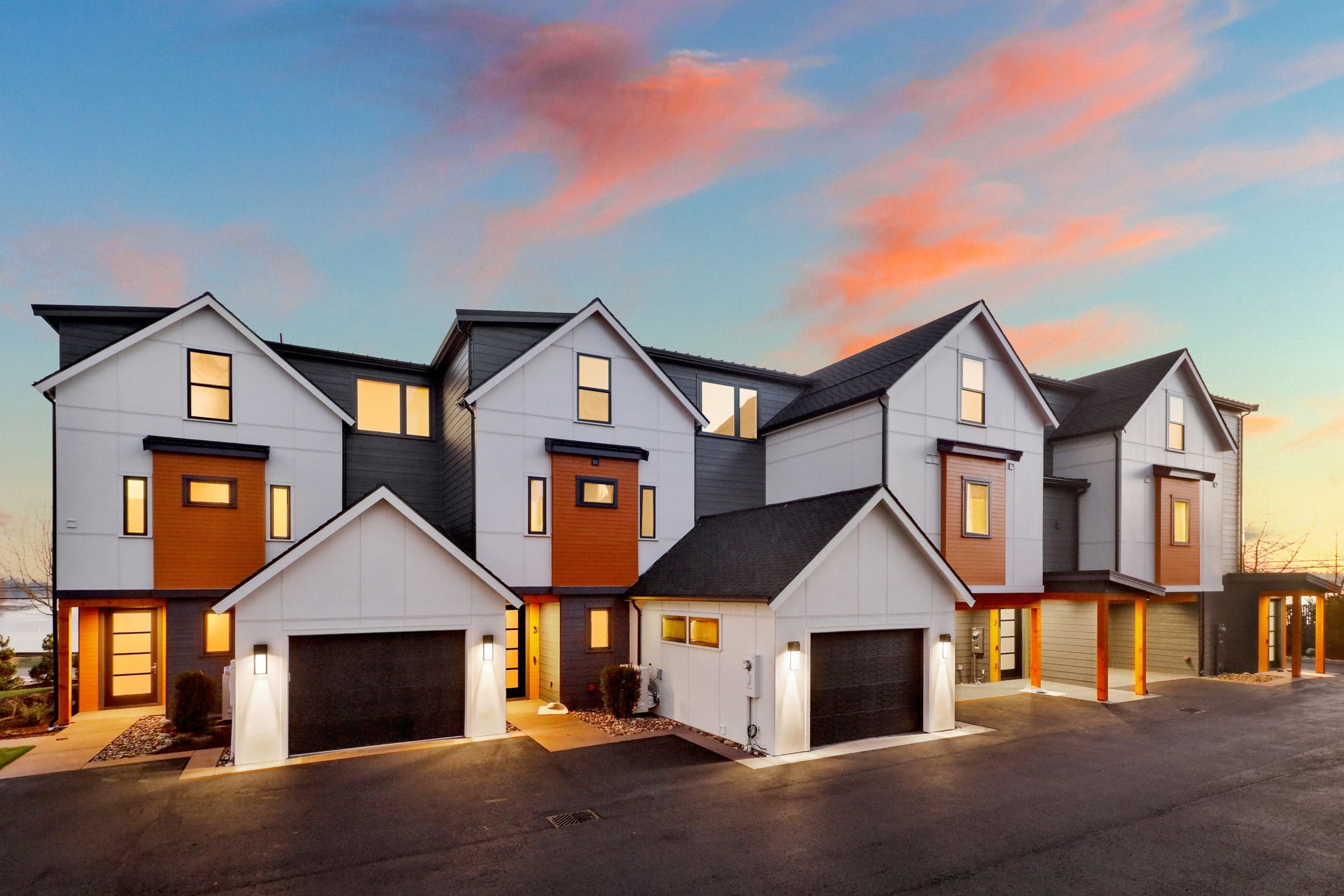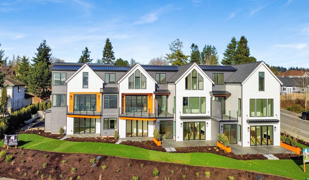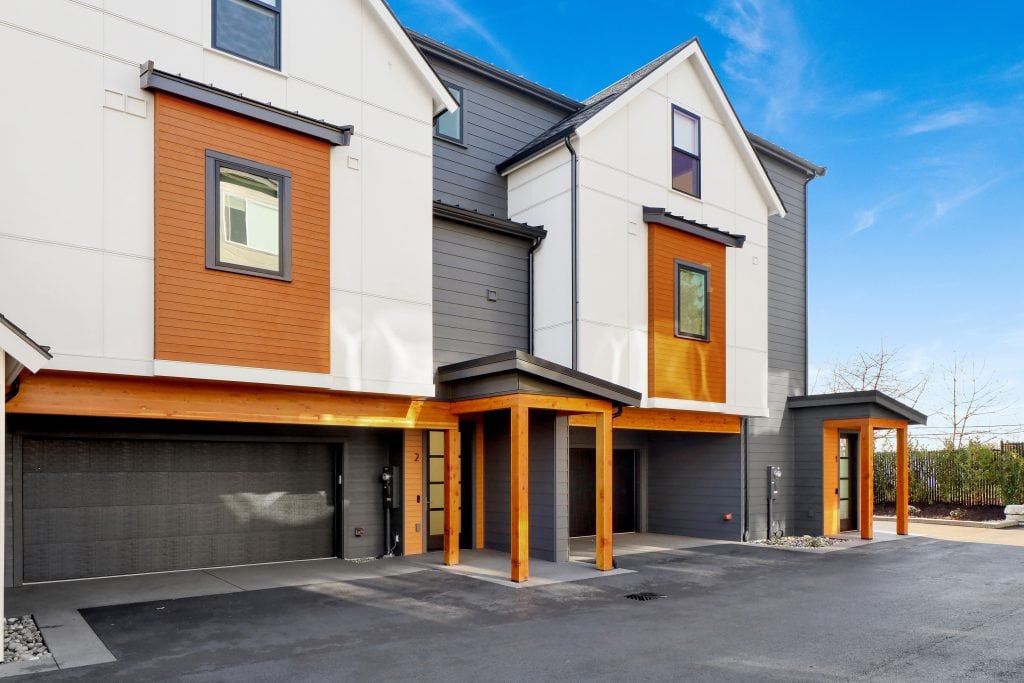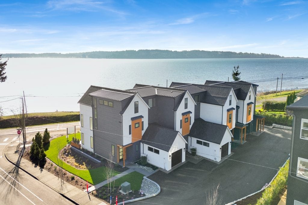 Salish Ridge Four is a modern Pacific Northwest fourplex that pairs clean gabled forms with a refined blend of wood-inspired siding, metal roofing, and crisp contemporary detailing. Set above the shoreline in Blaine, Washington, the three-story residences are thoughtfully shaped by the unique contours of the site, resulting in four distinct yet cohesive homes. Expansive windows throughout each unit frame sweeping water views and invite in soft coastal light, creating bright, airy interiors. Each residence features an attached garage and a vertically layered layout that balances openness with privacy. The design emphasizes simplicity, livability, and a strong connection to the surrounding landscape, offering modern comfort rooted in its coastal setting.
